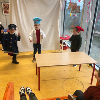 De poppenhoek verandert in een verkleedkamer met gordijn en een podium. Het publiek kan naar de show kijken vanuit de zetel en kan applaus geven. Op deze manier gebruiken de kinderen op een actieve manier de woordenschat die we aanbrengen.